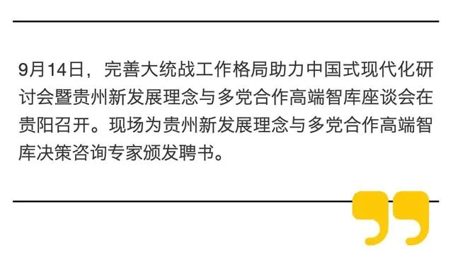 9月14日,完善大统战工作格局助力中国式现代化研讨会暨贵州新发展理念与多党合作高端智库座谈会在贵阳召开,深入学习贯彻党的二十届三中全会和省委十三届五次全会精神,充分发挥统一战线凝聚人心、汇聚力量政治作用,为谱写中国式现代化贵州篇章贡献智库力量。