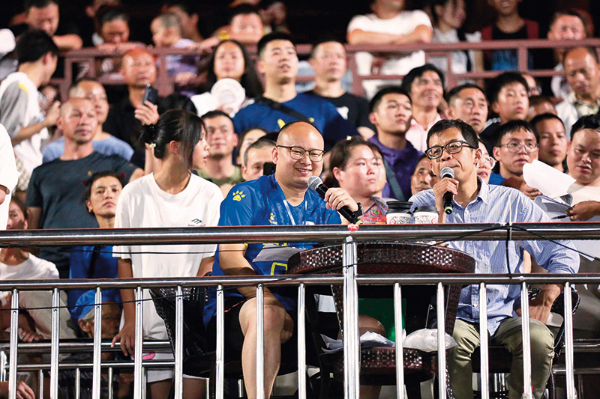 杨兵(左)与张明涛在“村超”球场解说(2023年6月22日摄)。黄万鑫摄