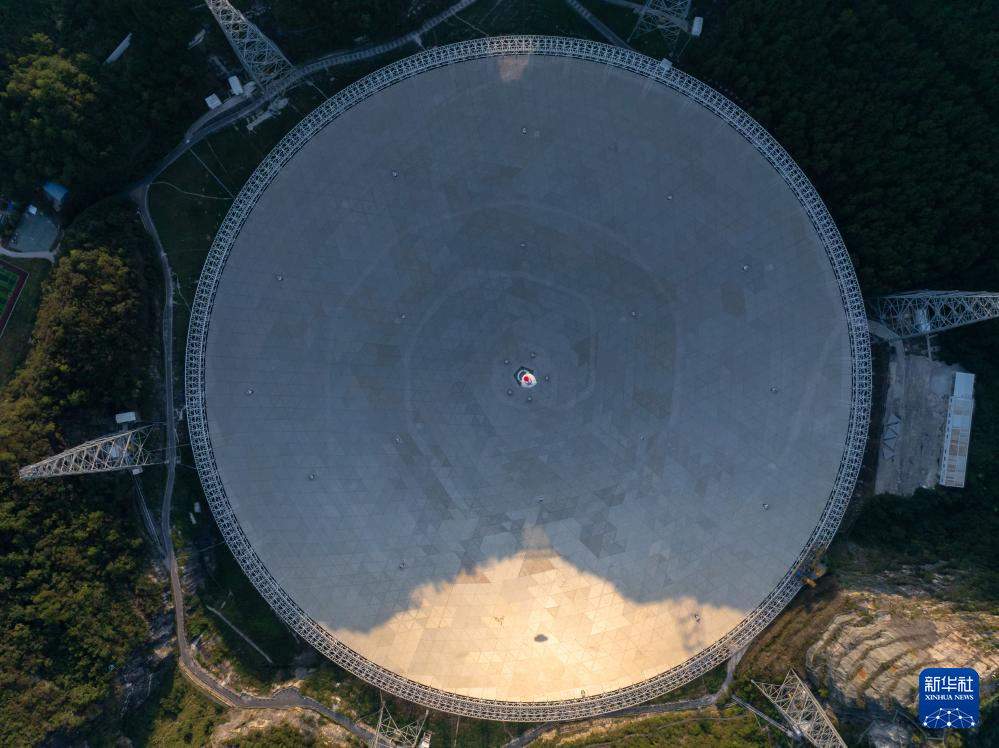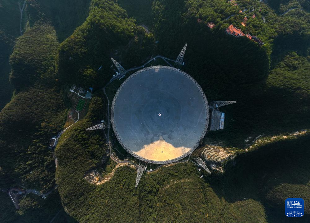 中国天眼在落日余晖中(无人机照片,维护保养期间拍摄,9月25日摄)。