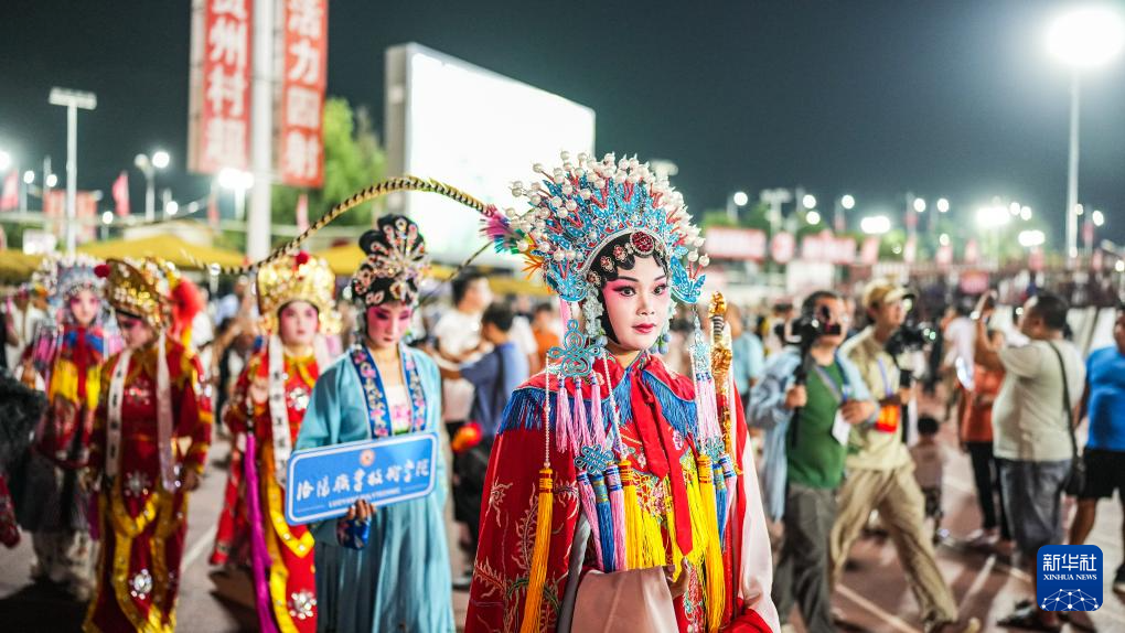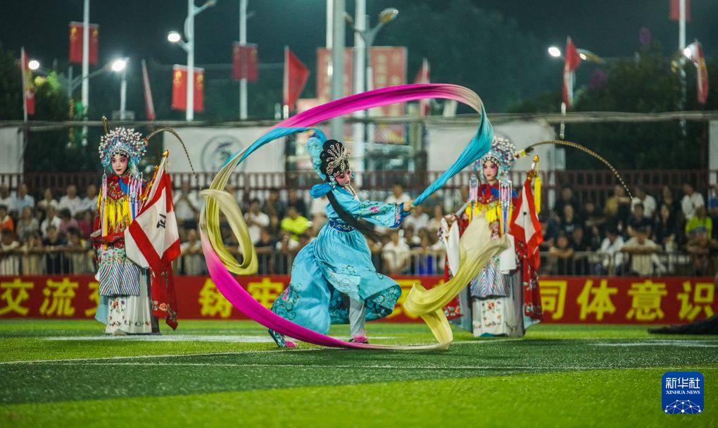 9月28日,洛阳职业技术学院的演员们在“村超”足球场上表演。新华社记者 陶亮 摄