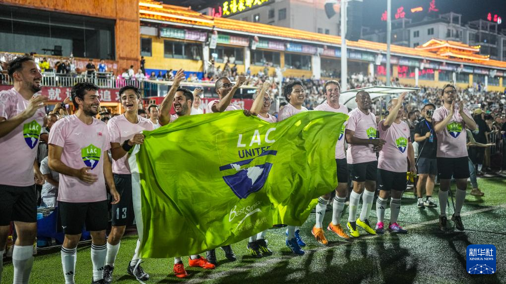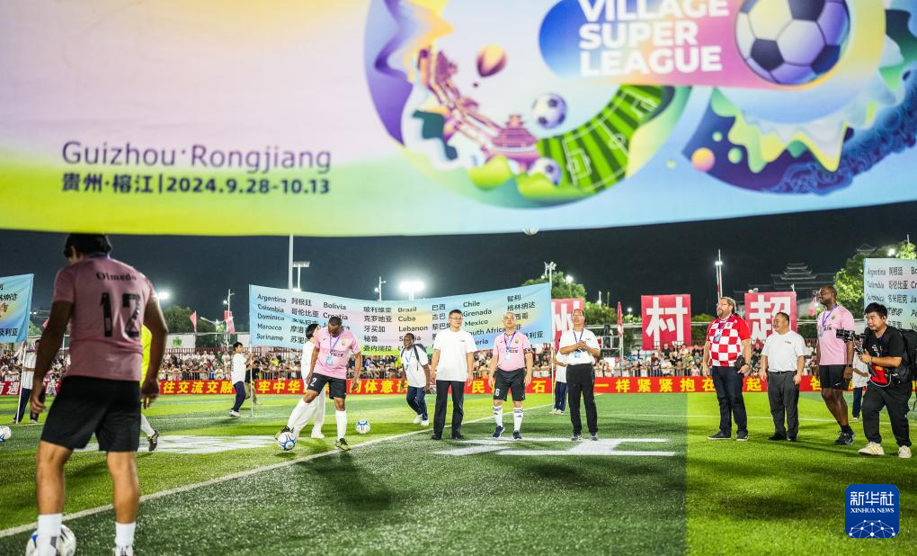 当日,“发现中国之美·相约贵州村超”国际友谊赛在贵州省黔东南苗族侗族自治州榕江县的“村超”足球场举行。24名驻华外交官与当地“村超”球队进行了一场国际友谊赛。