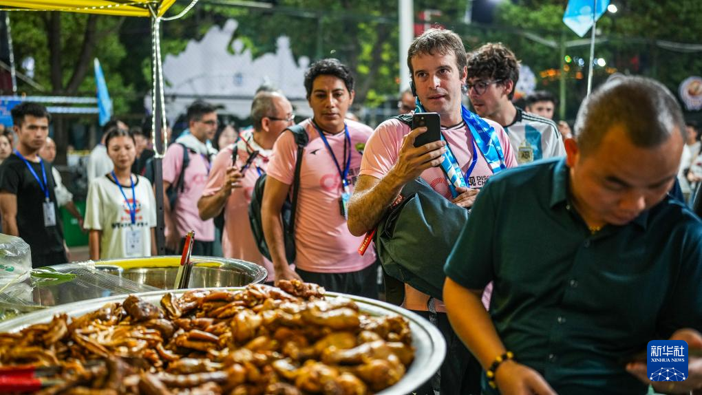 9月28日,阿根廷驻华大使马致远(右二)和使馆外交官们在市集上同一名身穿阿根廷足球队服的小朋友合影。新华社记者 陶亮 摄