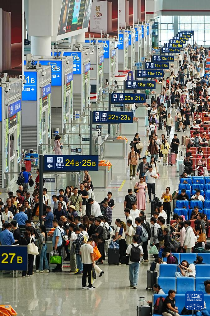 9月29日,旅客在贵阳北站候车大厅排队检票。