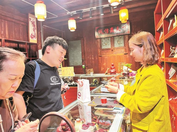 10月3日,游客们在铜仁市中南门古城老街的一家朱砂店里挑选朱砂配饰。