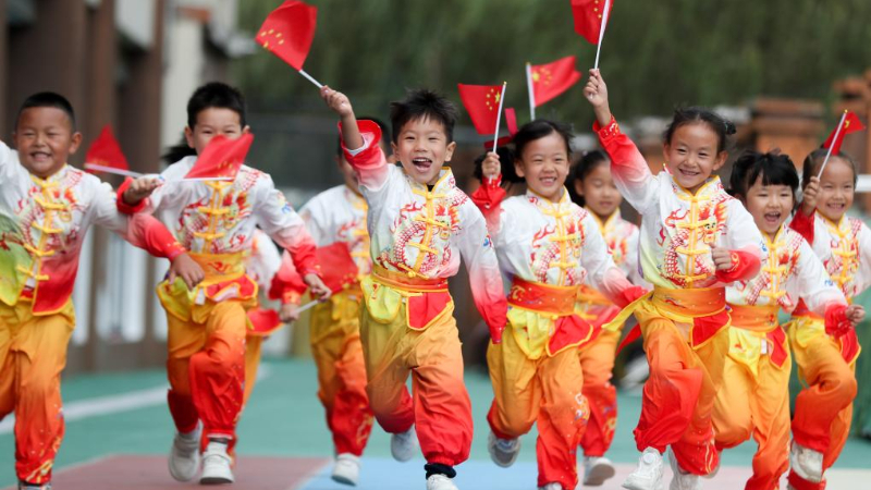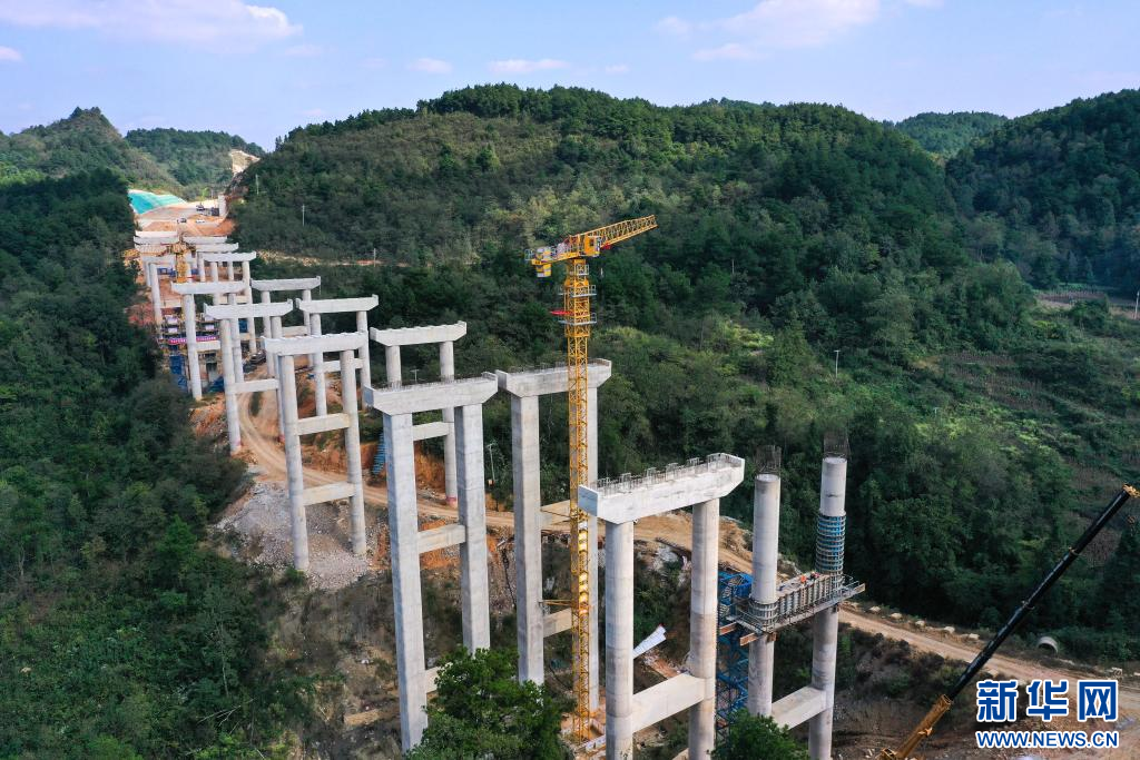 10月9日,中铁二十局的工人在贵州乌长高速1标段乌龟田大桥上施工(无人机照片)。新华社记者 杨文斌 摄