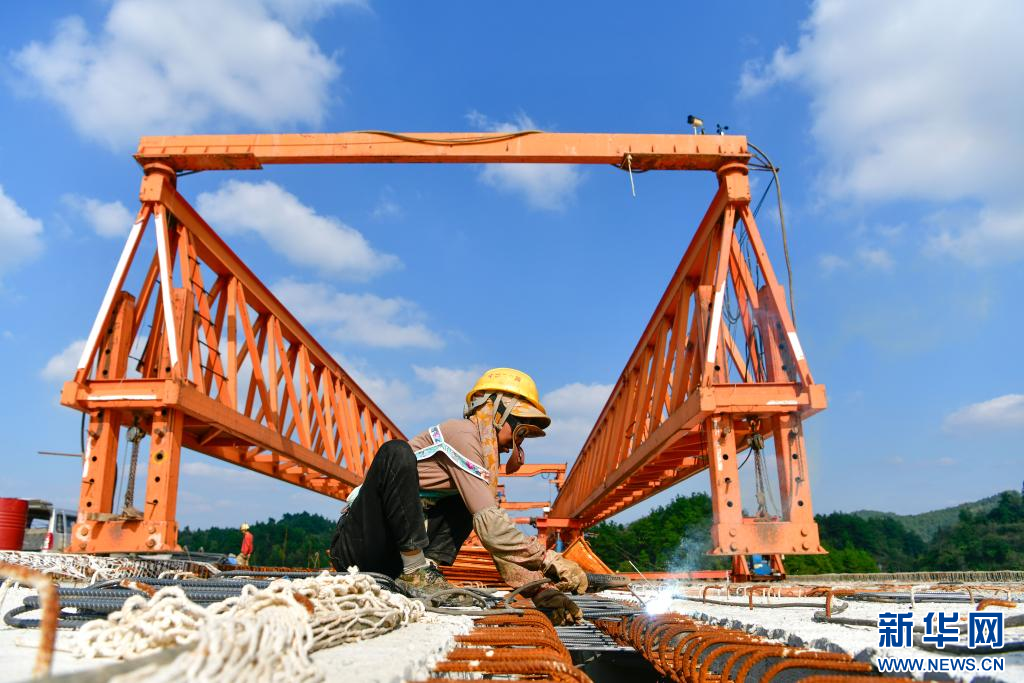 10月9日,中铁二十局的工人在贵州乌长高速1标段穿洞大桥上施工。新华社记者 杨文斌 摄