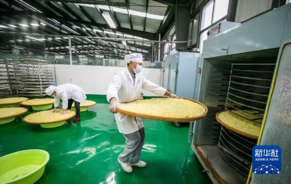 织金县猫场镇皂角产业园内,工人在皂角加工车间里搬运皂角米。新华社发 罗大富 摄