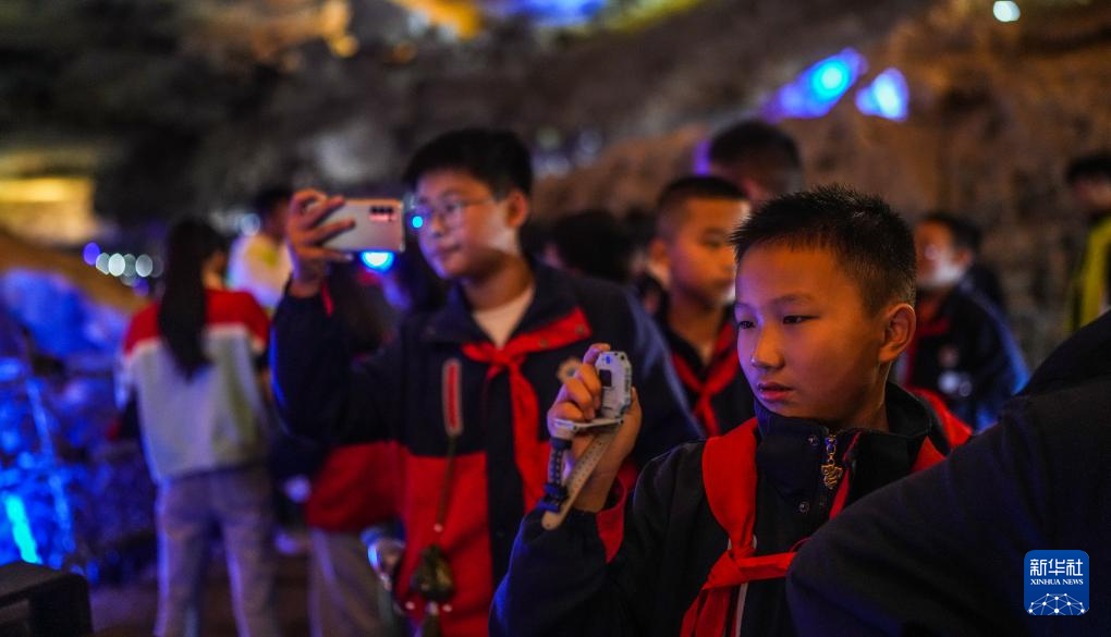 10月23日,遵义市红花岗区第二十小学的学生们在双河洞景区体验探洞研学。新华社记者 陶亮 摄
