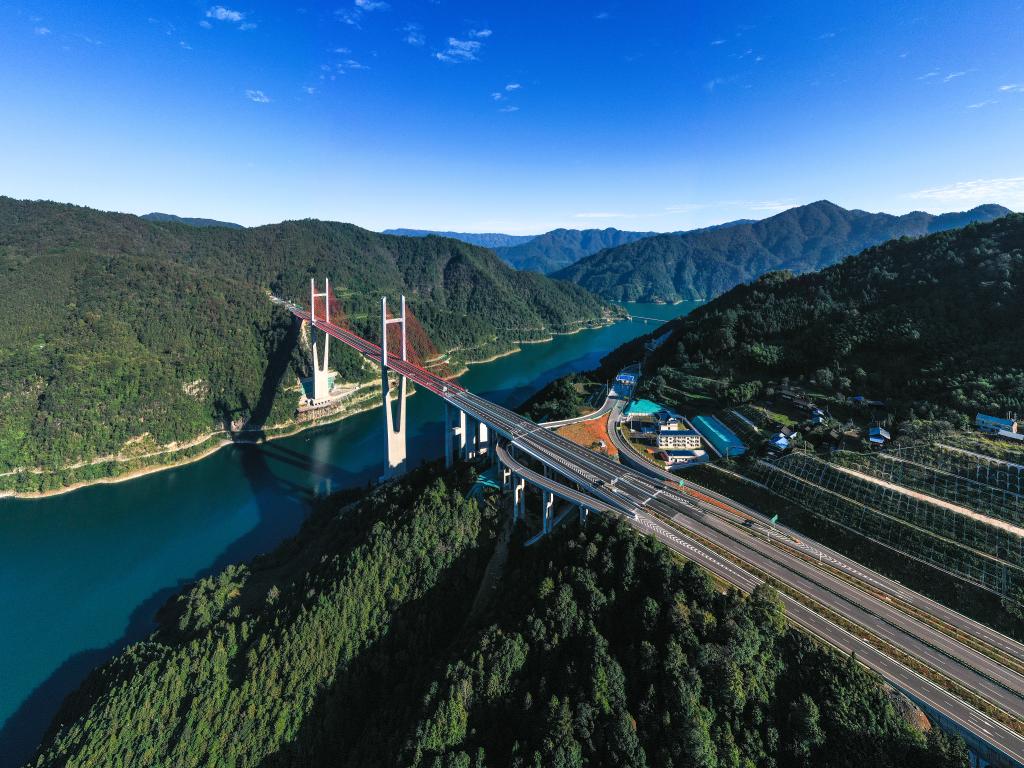 10月25日,车辆在贵州剑黎高速南孟溪大桥上行驶(无人机照片)。