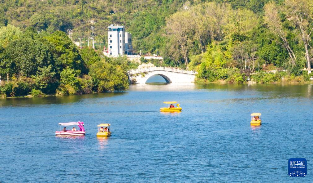10月26日,人们在贵州省安顺市西秀区虹山湖乘船游玩(无人机照片)。