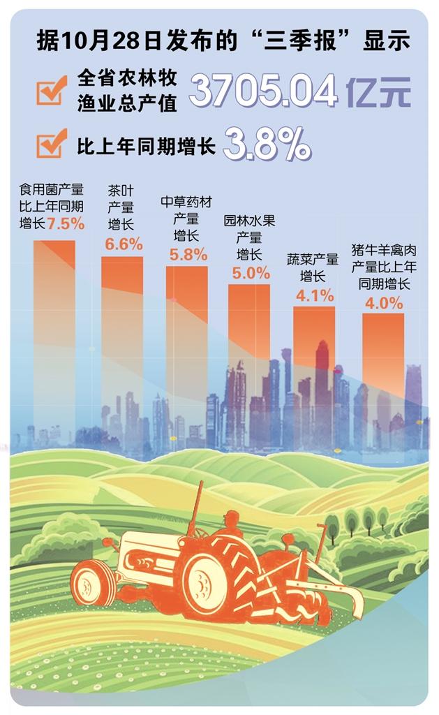 据10月28日发布的“三季报”显示,全省农林牧渔业总产值3705.04亿元,比上年同期增长3.8%。其中,食用菌产量比上年同期增长7.5%,茶叶产量增长6.6%,中草药材产量增长5.8%,园林水果产量增长5.0%,蔬菜产量增长4.1%。猪牛羊禽肉产量比上年同期增长4.0%。其中,猪肉产量增长5.2%。前三季度生猪出栏增长1.7%。