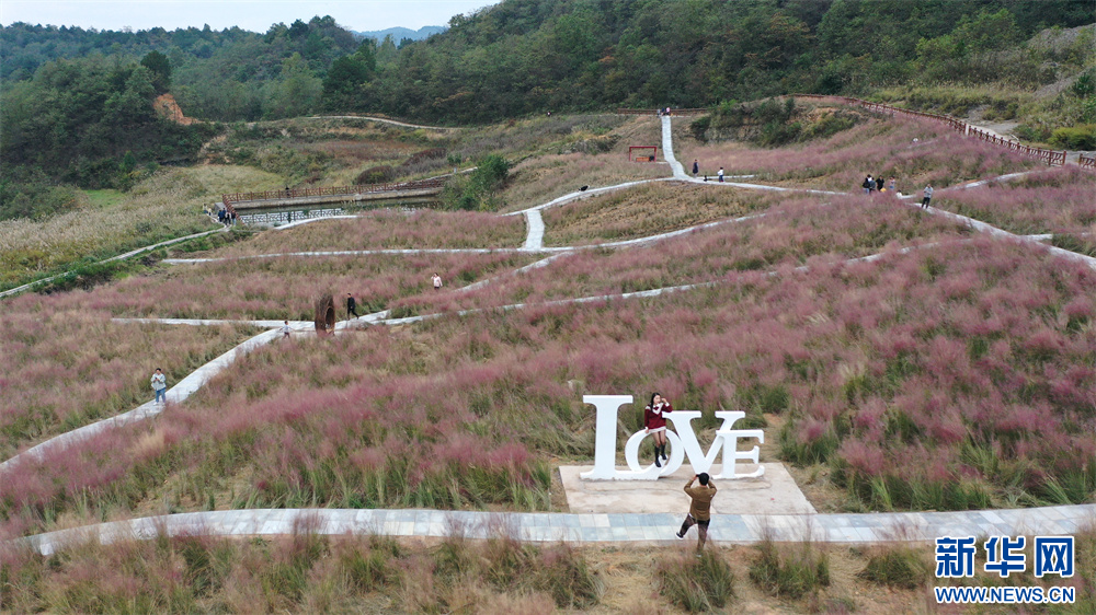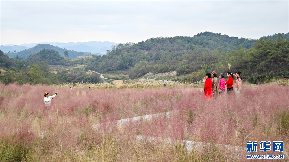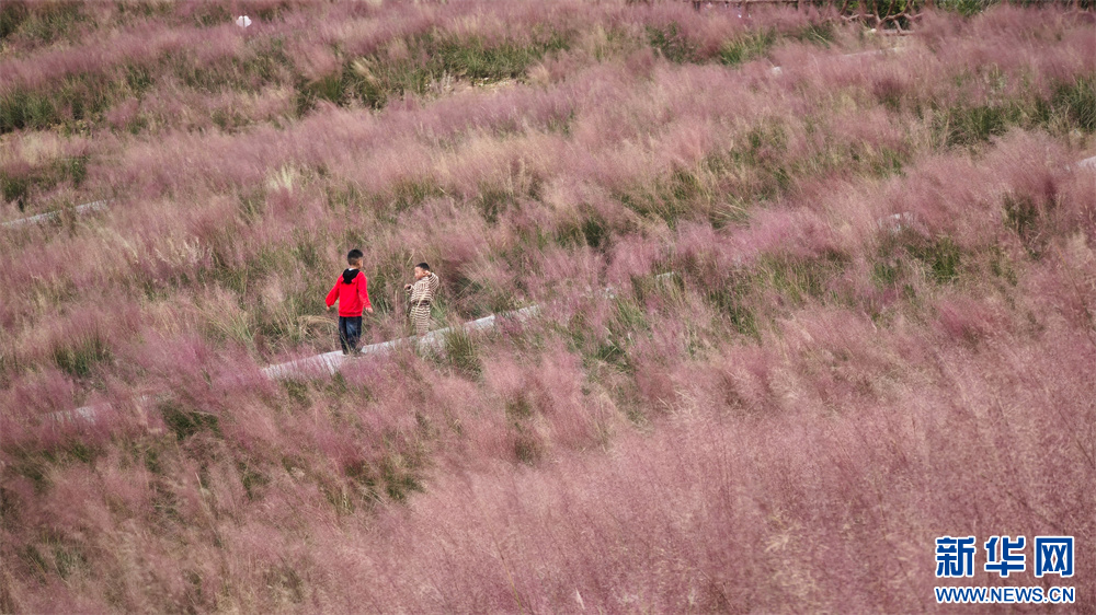 近日,贵阳市白云区牛场布依族乡石龙村石板田现代农业园内的粉黛乱子草开得正艳,吸引不少游客前来游玩观赏。
