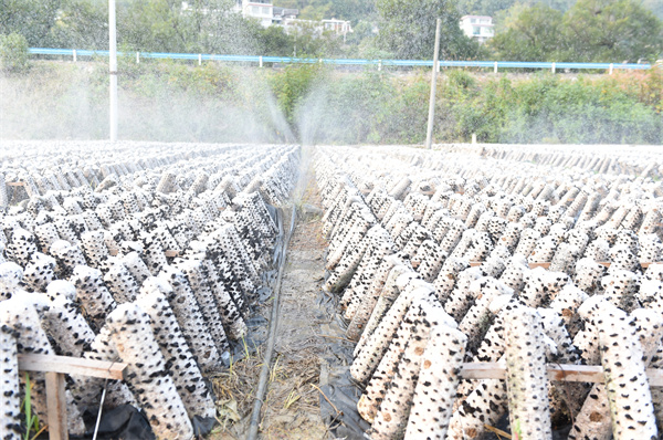 基地正在通过抽水进行对黑木耳生长浇水。