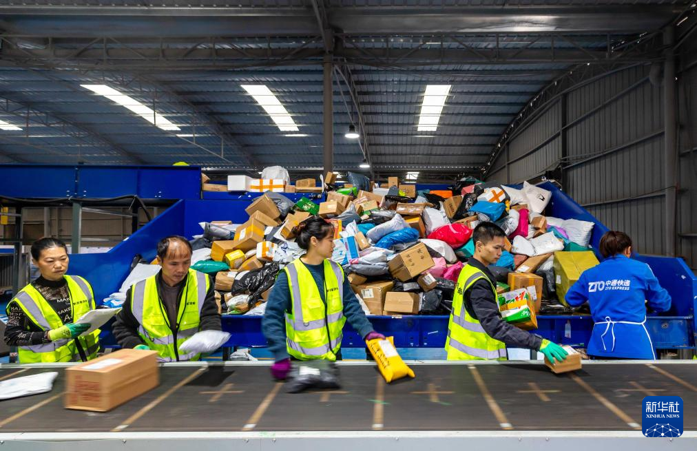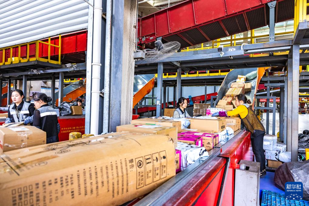 11月11日,工作人员在贵州省安顺市西秀区一家快递物流中心分拣快递。新华社发(陈熙摄)