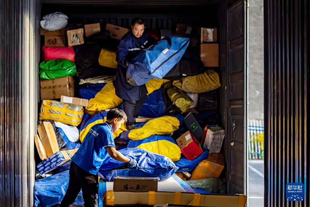 11月11日,工作人员在贵州省黔西市双桥客运站快递物流中心卸载快递。新华社发(范晖 摄)