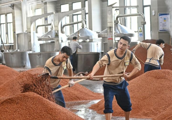 四川古蔺郎酒厂的工人在酿造车间工作(2024年10月15日摄)。新华社记者 刘坤 摄