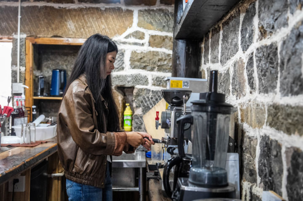 在云南省威信县水田镇龙洞村湾头村民小组,村民在自家的咖啡馆里制作咖啡(2024年10月31日摄)。新华社记者 胡超 摄