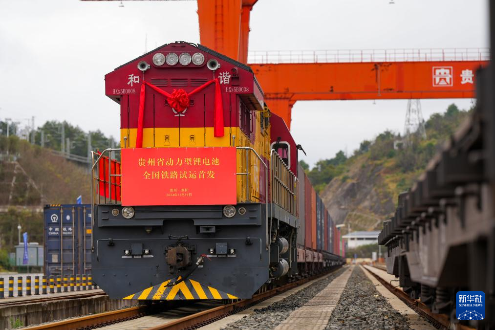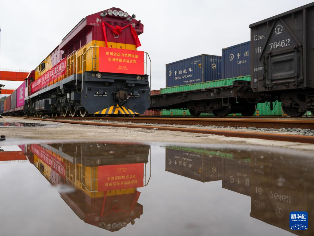 11月19日,一列搭载动力锂电池的列车停靠在贵阳国际陆港都拉营站。新华社发(龙建睿 摄)