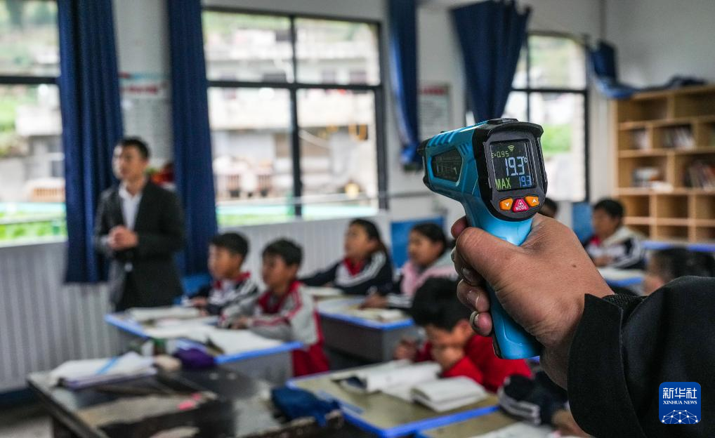 测温设备检测供暖的亮岩小学教室内温度为19.3摄氏度(11月21日摄)。