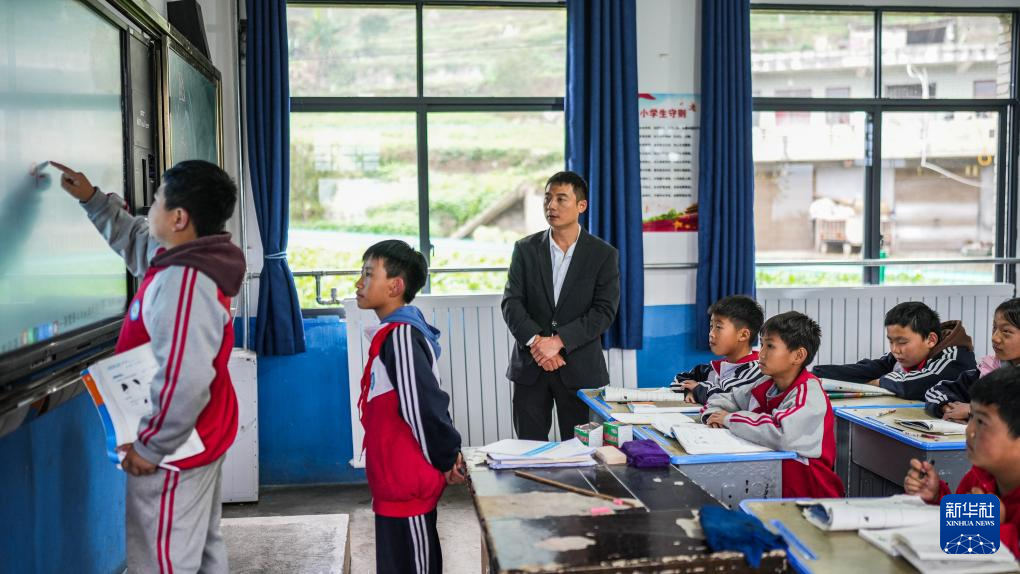 在供暖的亮岩小学,老师指导孩子学习(11月20日摄)。新华社记者 陶亮 摄