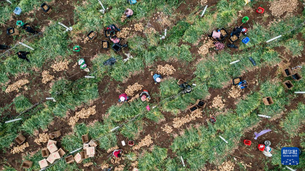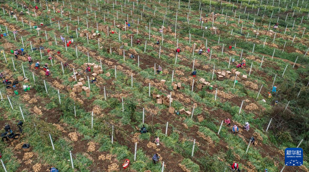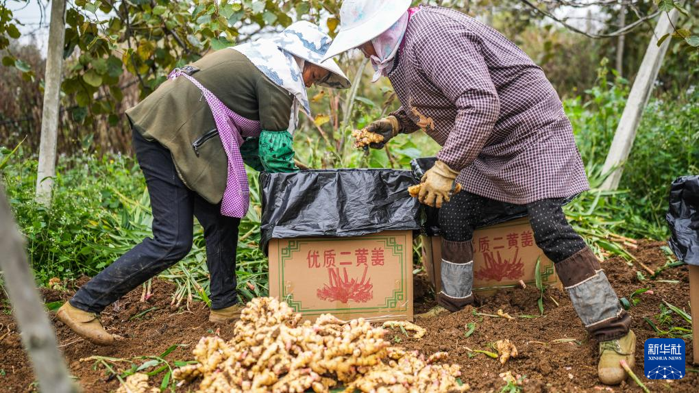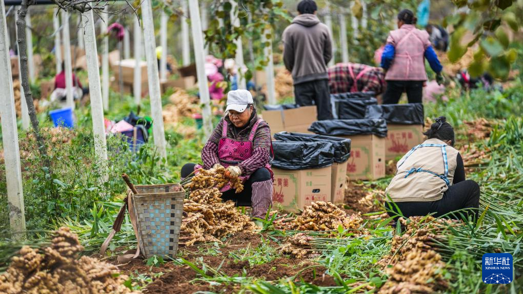 初冬时节,贵州省六盘水市六枝特区木岗镇种植的5000余亩生姜迎来丰收季,当地群众忙着采摘、分拣,田间地头一派繁忙景象。
