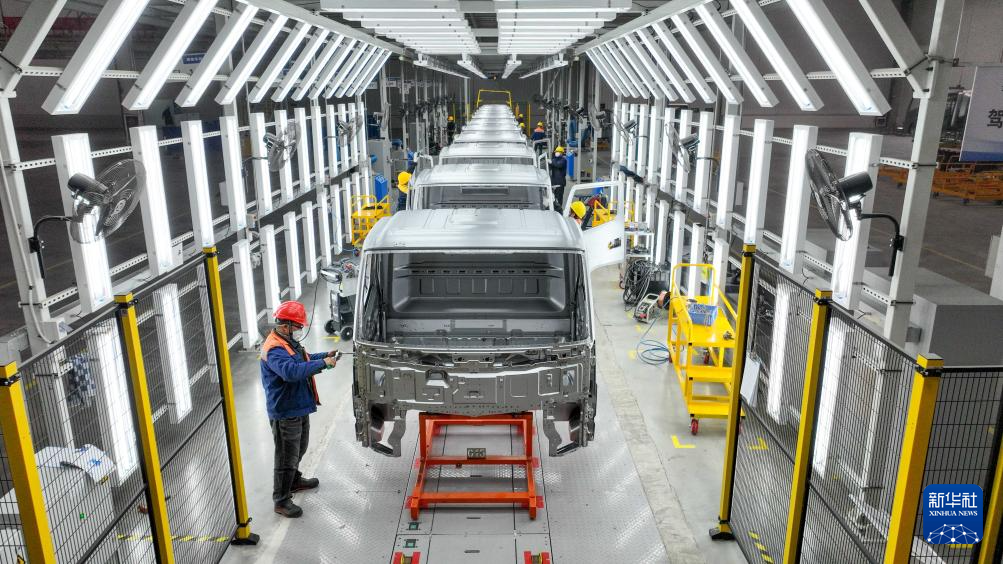 12月11日,工人在贵州省贵安新区贵州长江汽车有限公司生产车间作业(无人机照片)。
