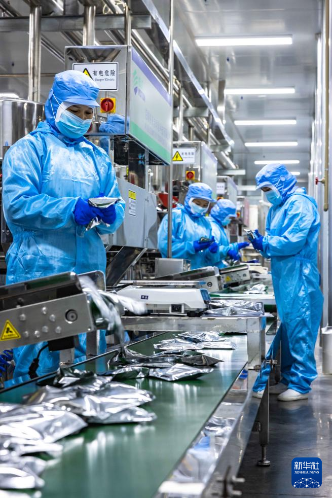 12月12日,工作人员在贵州省安顺市西秀区南山婆食品生态产业园对成品酸汤粉进行包装。新华社发(陈熙摄)