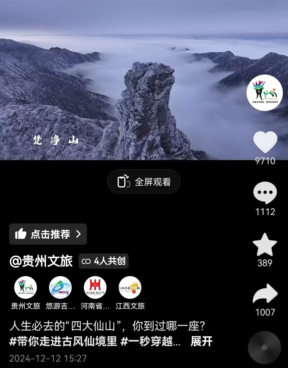 日前,贵州省文旅厅官方抖音账号发布了由梵净山、老君山、武功山、长白山四家知名5A级山岳型景区共同创作的宣传视频,并与河南、江西、吉林三省文旅厅官方账号互动,引得众多网友关注。