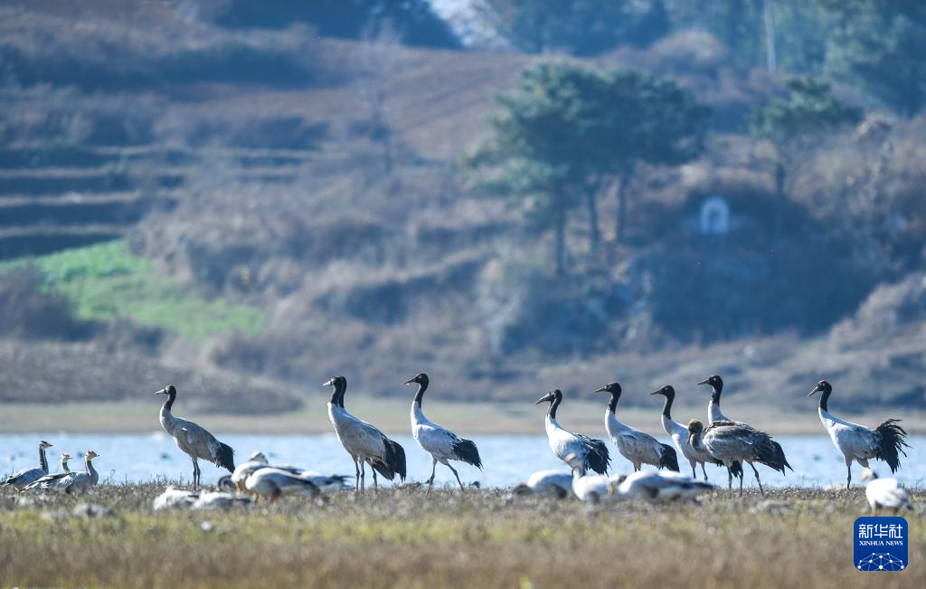这是12月16日在贵州草海国家级自然保护区拍摄的黑颈鹤和斑头雁。新华社记者 杨文斌 摄