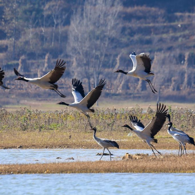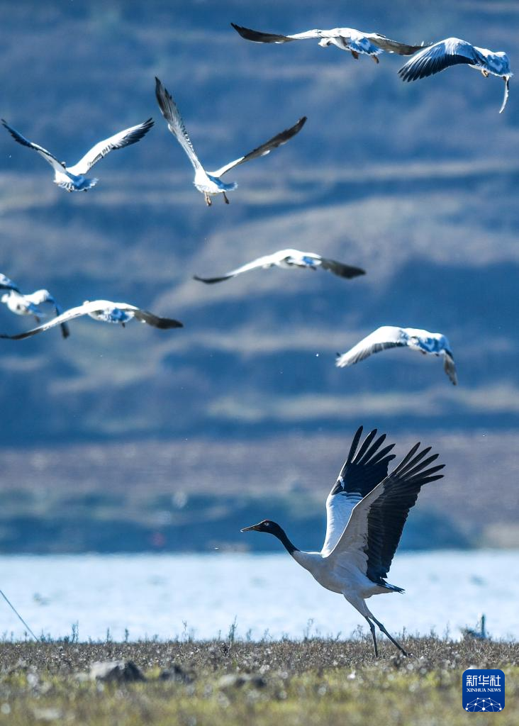 目前,前来草海越冬的黑颈鹤已达2500余只,加上灰鹤、斑头雁、赤麻鸭等,鸟类总数将达10万只,呈现万鸟翔集的生态景象。
