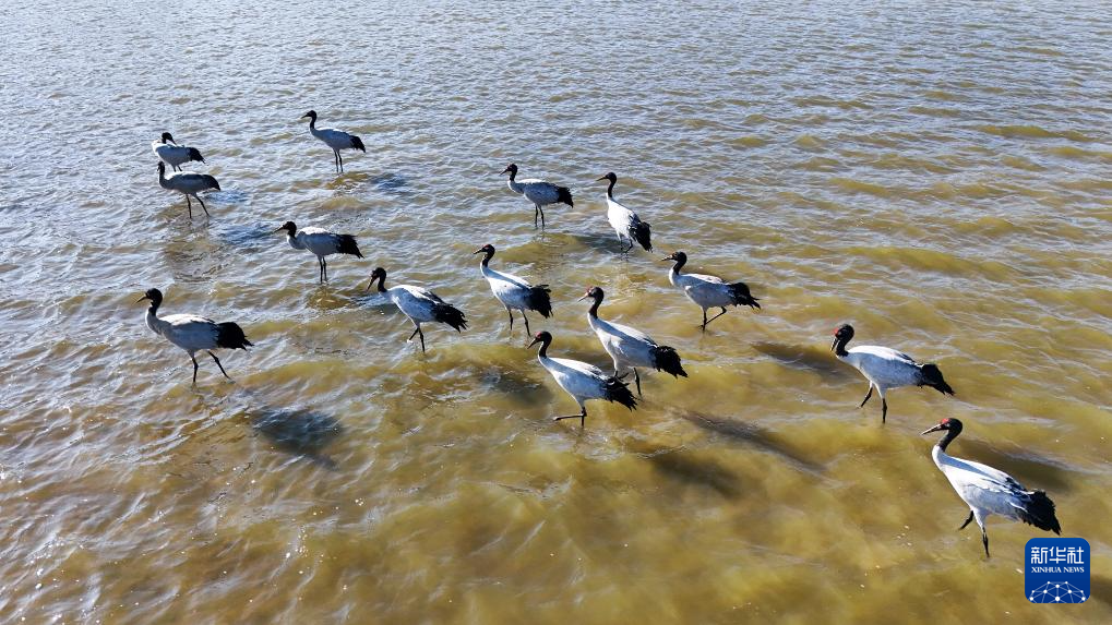 这是12月16日在贵州草海国家级自然保护区拍摄的黑颈鹤(无人机照片)。新华社发(王纯亮摄)