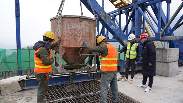 工人们正在对丘坝特大桥合龙段浇筑混凝土。(曾妮 摄)