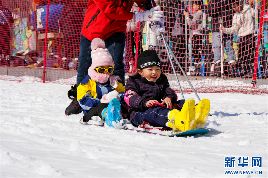 12月29日,在贵州省六盘水市钟山区梅花山国际滑雪场,两名小朋友坐在滑雪板上体验滑雪。新华网发(龙建睿 摄)