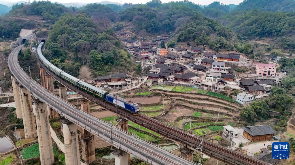 1月18日,5640次列车驶过贵州省凯里市炉山镇六个鸡村(无人机照片)。新华社发(龙建睿 摄)
