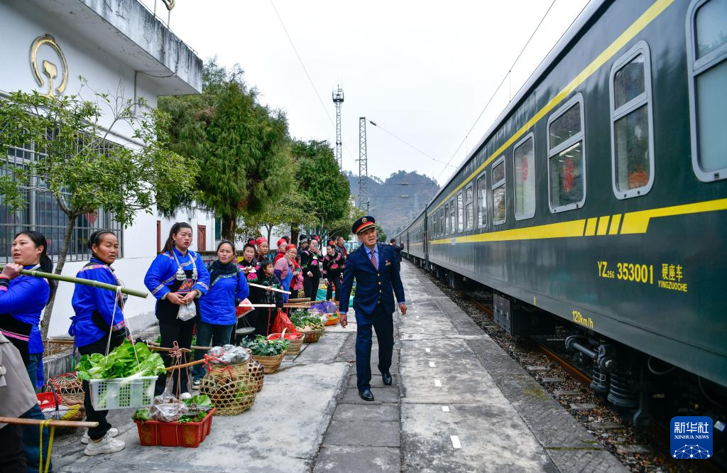 1月18日,在沪昆铁路六个鸡火车站,铁路工作人员与村民交流当天售卖的农产品情况。新华社记者 杨文斌 摄