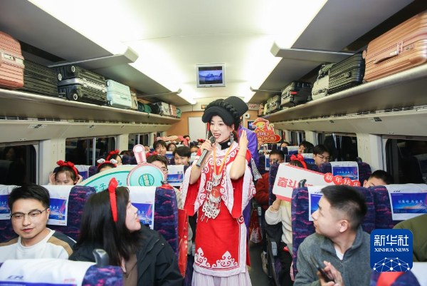 1月23日,工作人员在返乡务工专列上为乘客表演节目。新华社发