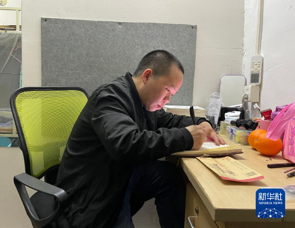 1月21日,农民工杨秀祥在出租屋里登记爱心捐助信息。新华社记者 骆飞 摄