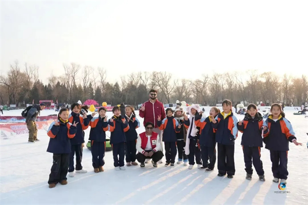 同学们在圆明园冰雪游乐场与外国友人合影留念。