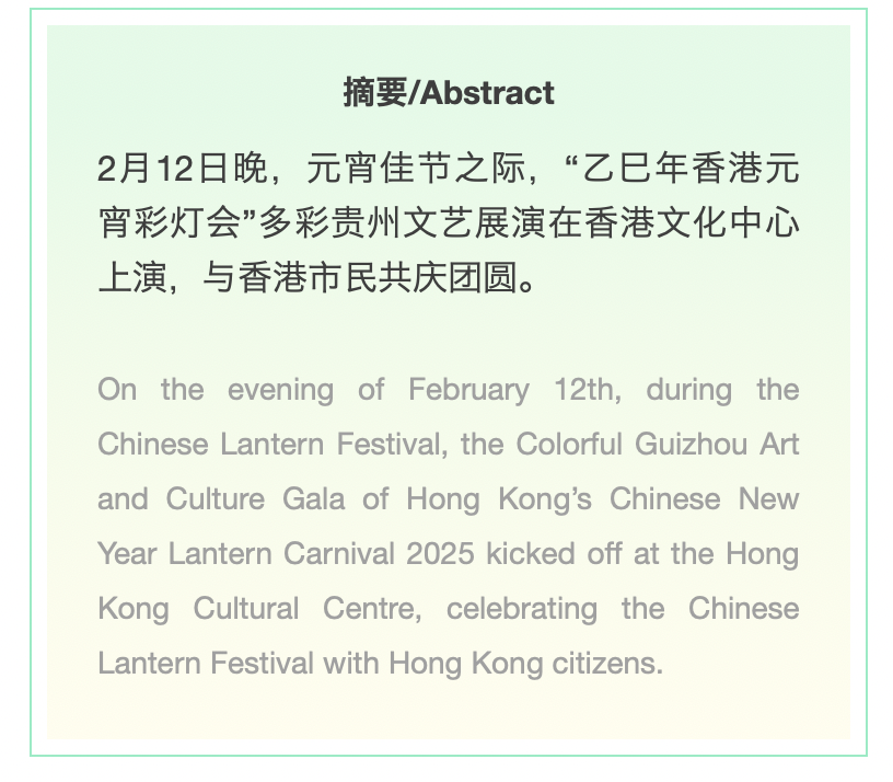 华灯竞处,人月圆时。2月12日晚,元宵佳节之际,星光璀璨的维多利亚港畔,随着舞蹈《春暖花开》打开贵州春天的姹紫嫣红,“乙巳年香港元宵彩灯会”多彩贵州文艺展演在香港文化中心露天广场拉开帷幕,与香港市民共庆团圆。
