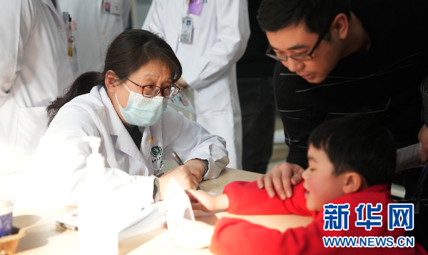 2月28日,贵州医科大学儿科学院院长、贵州医科大学附属医院儿童神经科主任艾戎在义诊时问诊。新华网 卢志佳 摄