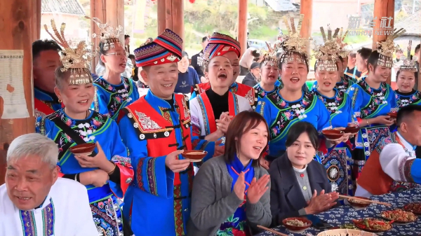 近日,在贵州省铜仁市万山区黄道侗族乡丹阳村瓦寨传统村落,当地举行“侗乡春社”暨全民融合系列活动,活动内容有春社祈福、傩戏表演、农耕演绎、山歌合唱、鼟锣展演、吃长桌宴等特色节目,吸引了众多游客。