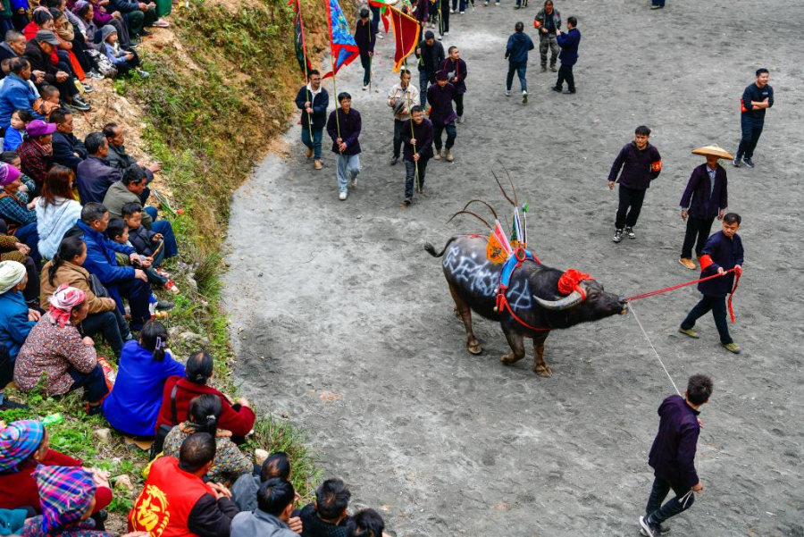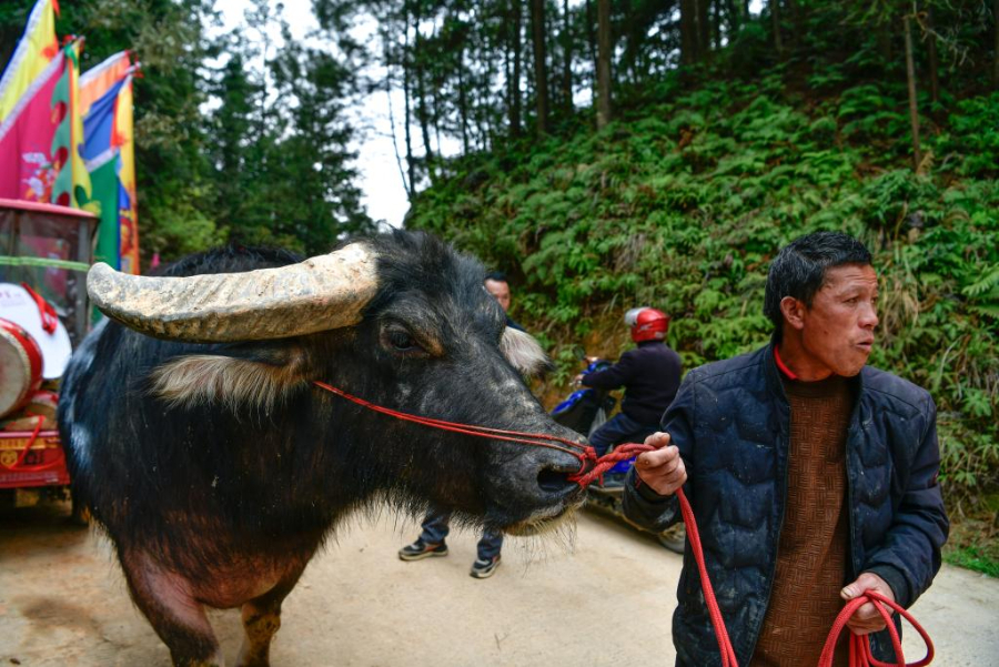 4月6日,人们在贵州省锦屏县固本乡东庄村观看斗牛游塘仪式。新华社记者 杨文斌 摄