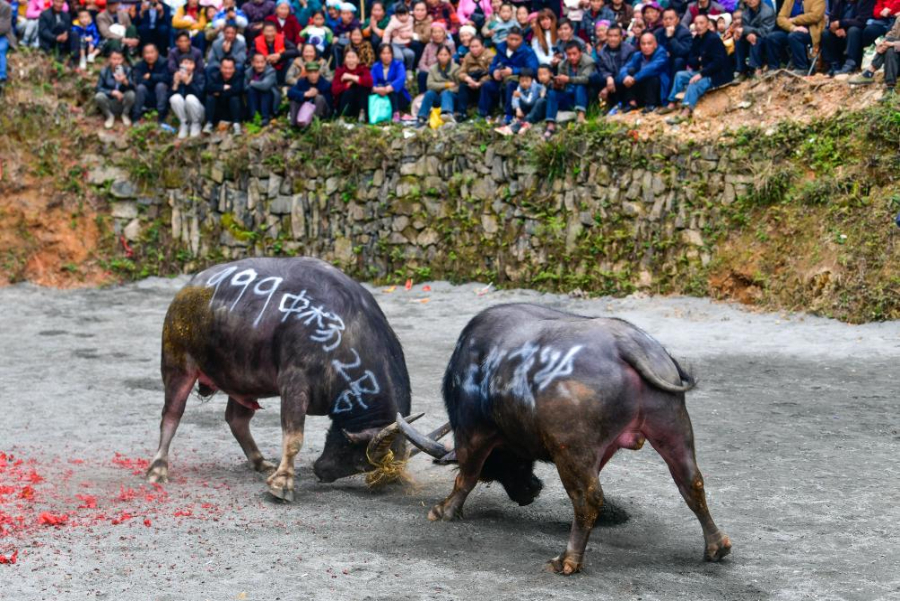 当日,贵州省黔东南苗族侗族自治州锦屏县固本乡举办2025年新民片区三月初九牯藏节斗牛民俗活动,来自各苗乡侗寨的人们齐聚斗牛塘,斗牛欢庆牯藏节。