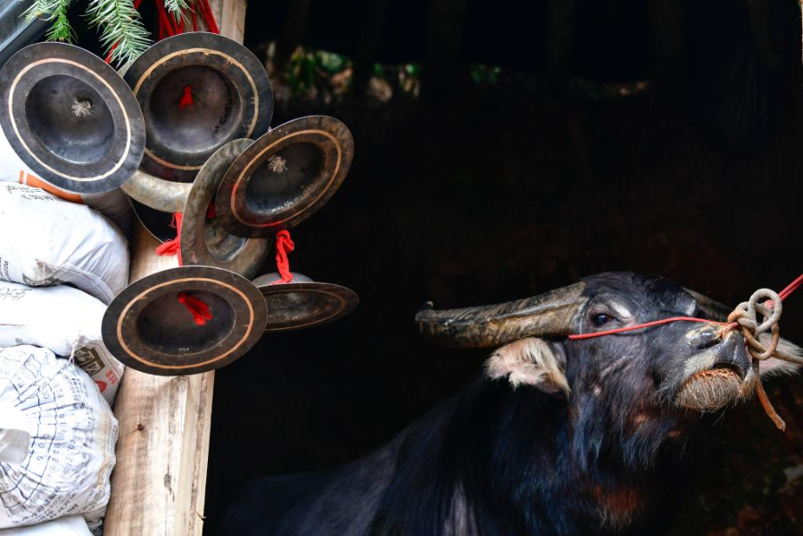 4月6日,在贵州省锦屏县固本乡东庄村,参加斗牛活动的水牯牛在等待入场。新华社记者 杨文斌 摄