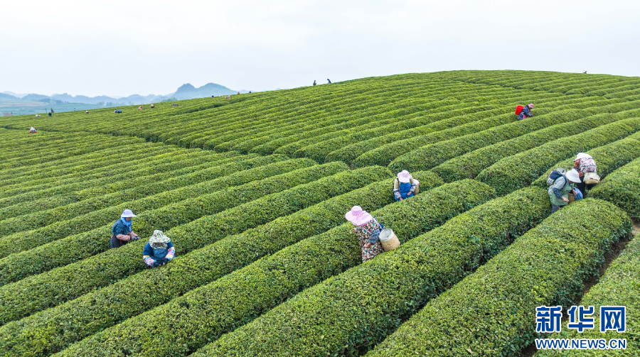 茶农在贵州省安顺市西秀区双堡镇银山茶场采摘明前茶(无人机照片,3月28日摄)。新华社发(陈熙 摄)