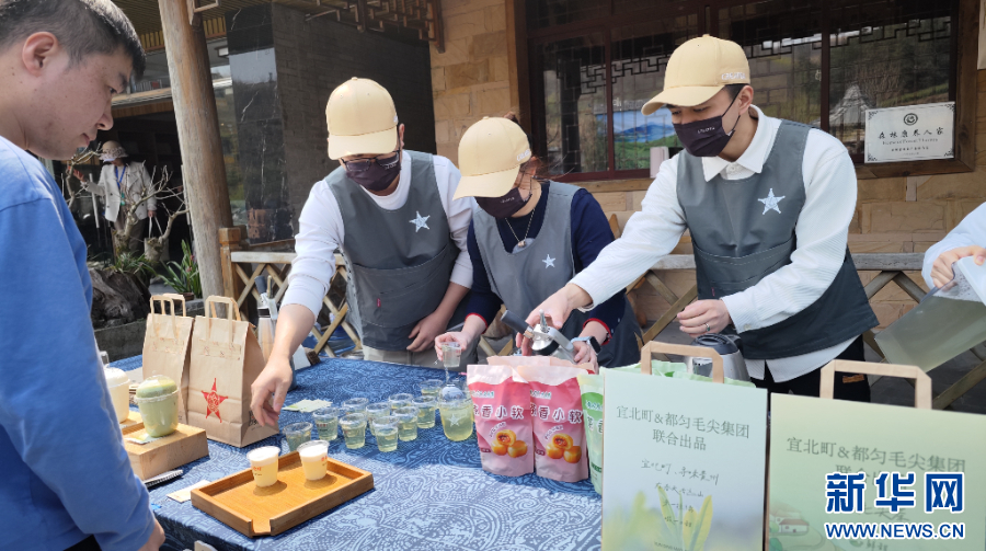 3月22日,宜北町现场设展推介与都匀毛尖联名茶饮。新华网 卢志佳 摄