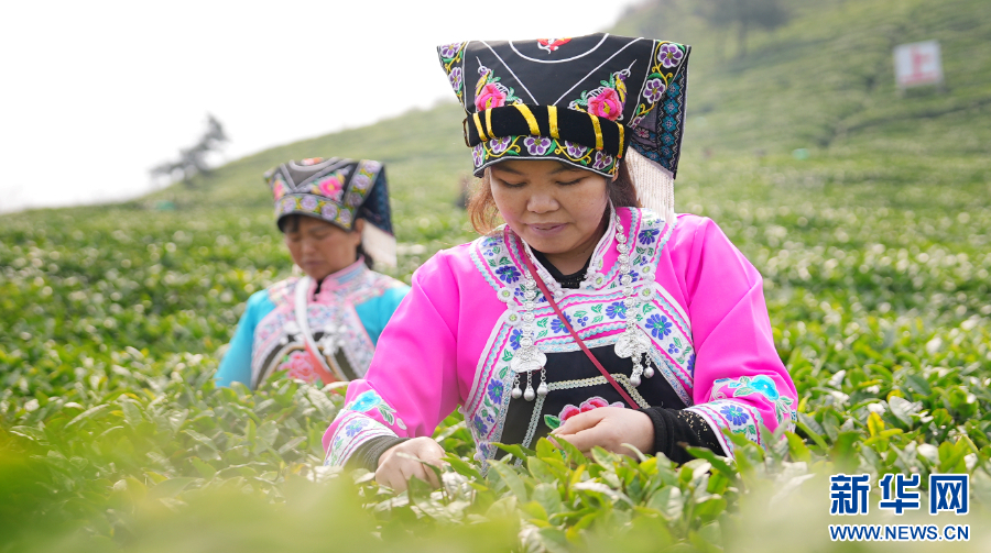 当地布依族群众在茶园里采摘新茶(3月22日摄)。新华网 卢志佳 摄