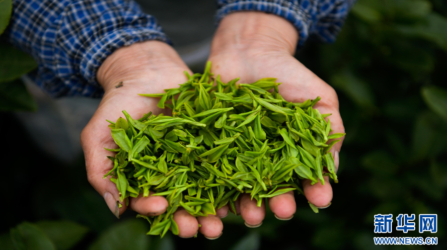 贵州省普安县茶源街道联盟村的茶农在展示新茶。新华社记者 杨文斌 摄