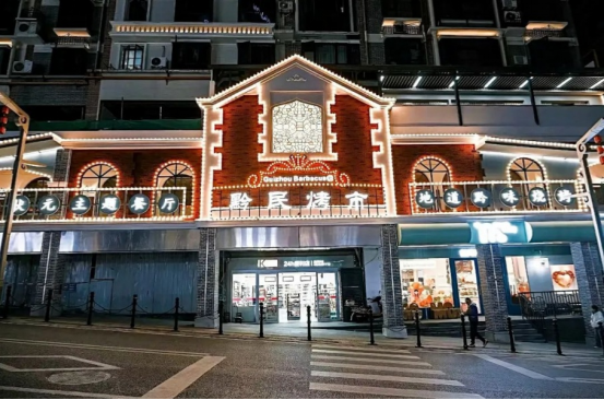 在下护国路,改造一新的黔民烤市古风黔味烧烤餐厅格外引人注目——青砖灰瓦的外立面保留着传统建筑韵味,开放式明档里厨师们身着统一服装娴熟烤制食材,墙上的电子屏实时显示厨房温湿度和消毒记录,加工区域的明档展示让前来光顾的食客吃得安心、放心。