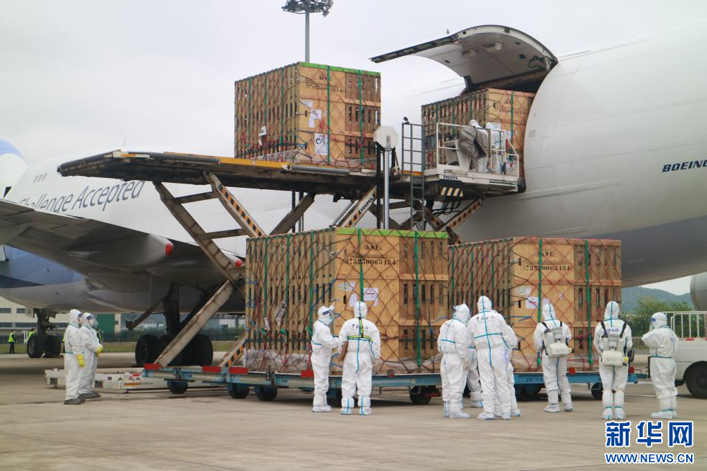 4月26日,在贵阳龙洞堡国际机场,贵阳海关工作人员正在装卸丹麦种猪。新华网发